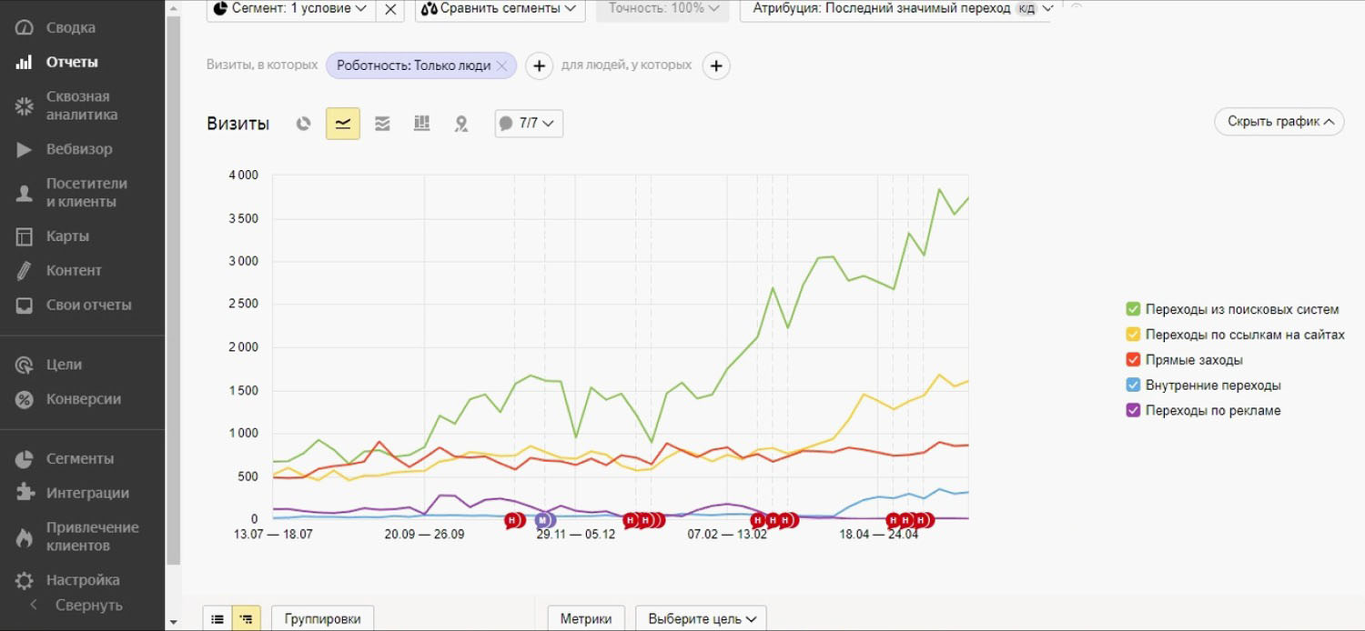 по данным Яндекс.Метрики, даже с учетом применения жесткой сегментации, среднее количество ежесуточных переходов составляет более 450 уникальных посетителей